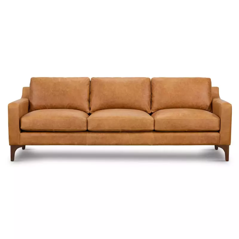 The rich Italian tanned leather upholstery provides a signature centerpiece for your cosmopolitan space. Its robust corner blocked solid wood frame is outfitted with supportive and high-density foam cushions with feather blend toppers for sink-right-in comfort. Sleek arched rubberwood legs in a luxe walnut finish form the finishing touch for the timeless beautiful sofa.