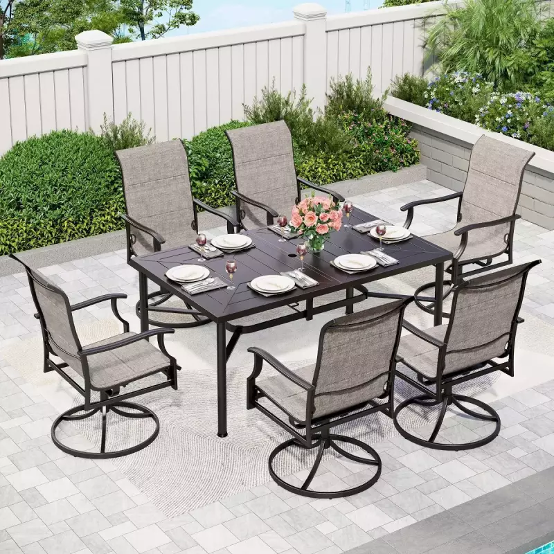 Heck Series - Outdoor extendable dining table set, including 8-people armchairs and a big dining table which can stretch up to 94.5 inches, suitable for 4 to 10 person family paties. The outdoor Metal Patio Set is combined with Top raw Teak Wood and space aluminum construction, with Environment-friendly powder coating finished. Weather resistant & anti-corrosion and UV protection make it suitable for a variety of outdoor environments, such as gardens, patio, balconies, poolside, etc. Sling Fabric press you a comfortable feeling and enjoy your relaxed time, because they are easy to clean and maintenance. Dining Table, Patio Set for 8 are suitable for most American families.