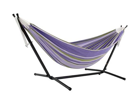 The Universal Hammock Stand with Double Hammock is our favorite and best-selling combo. The double hammock is made with 100% cotton, creating a comfortable refuge for an afternoon snuggle. The hammock stand is constructed of heavy duty steel and assembles in minutes without any tools. Plastic caps are used on the ends of the steel tubing to create a soft finish. You will enjoy the freedom the stand provides by allowing you to set up your hammock in the most convenient location and no longer rely on two perfect trees.